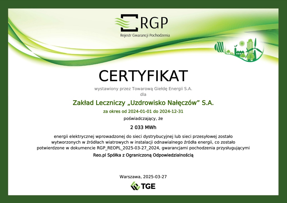 Dlatego z przyjemnością informujemy, że wraz z pozostałymi uzdrowiskami, należącymi do Grupy Uzdrowiska Polskie: „Uzdrowisko Iwonicz” SA, „Uzdrowisko Kamień Pomorski” SA oraz „Uzdrowisko Konstancin-Zdrój” SA, korzystamy z energii elektrycznej pochodzącej w 100% z odnawialnych źródeł energii.